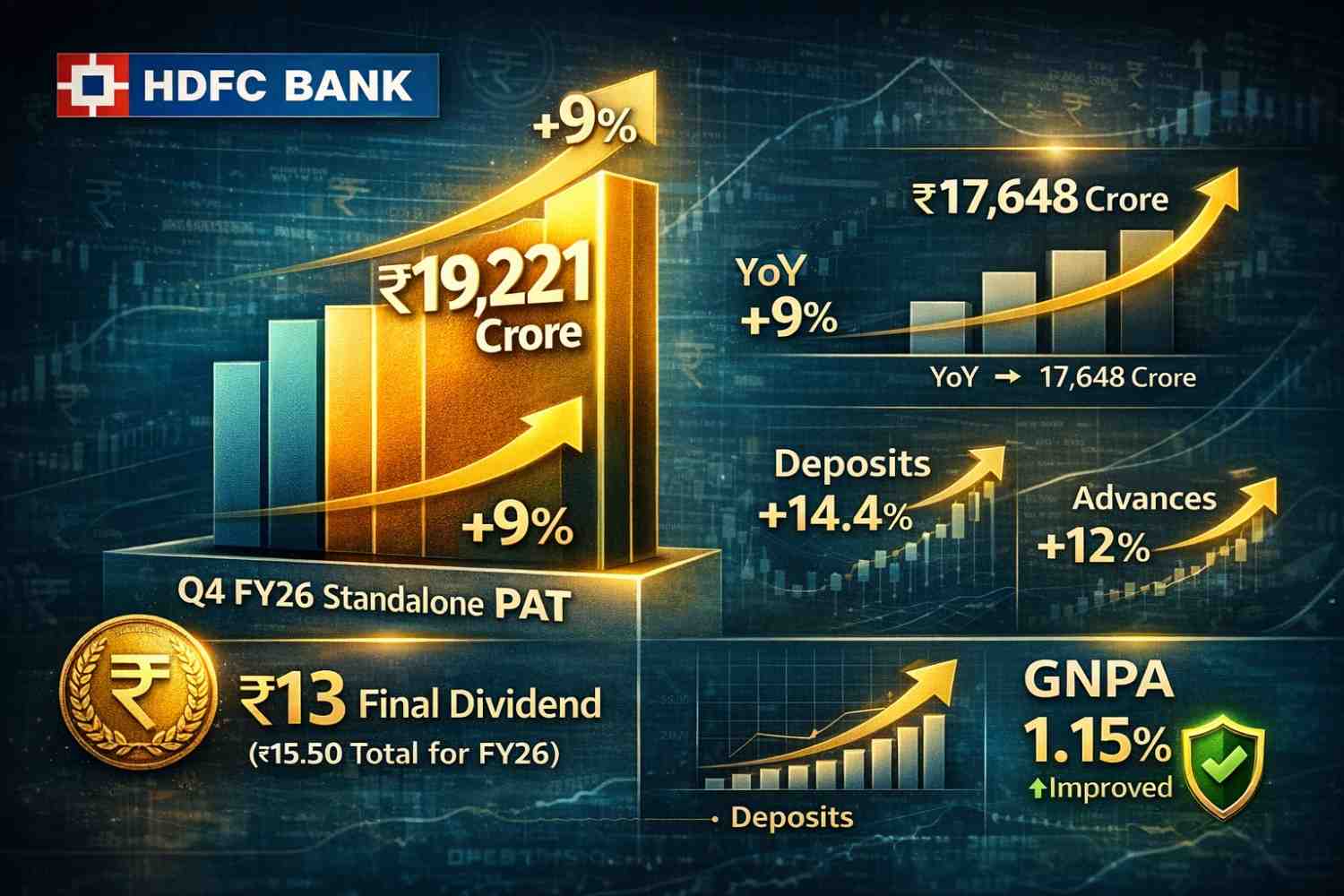 HDFC Bank posted a solid set of numbers for the January-March 2026 quarter, with standalone net profit rising 9% year-on-year to ₹19,221.05 crore. For the full FY26, standalone profit grew nearly 11% to ₹74,671.29 crore. The board also recommended a final dividend of ₹13 per share, taking the total dividend payout for the year to ₹15.50 per equity share of ₹1 face value (record date June 19, 2026). These figures mark a steady recovery phase after the 2023 merger with HDFC Ltd, where the focus has clearly shifted from integration challenges to balance-sheet optimisation and sustainable growth.