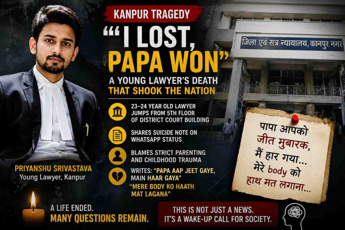 In a deeply disturbing incident from Kanpur, a young lawyer, Priyanshu Srivastava, tragically ended his life by jumping from the fifth floor of a court building. The shocking nature of the incident—taking place within the premises of a district court—has left not only the legal community but the entire country in disbelief.