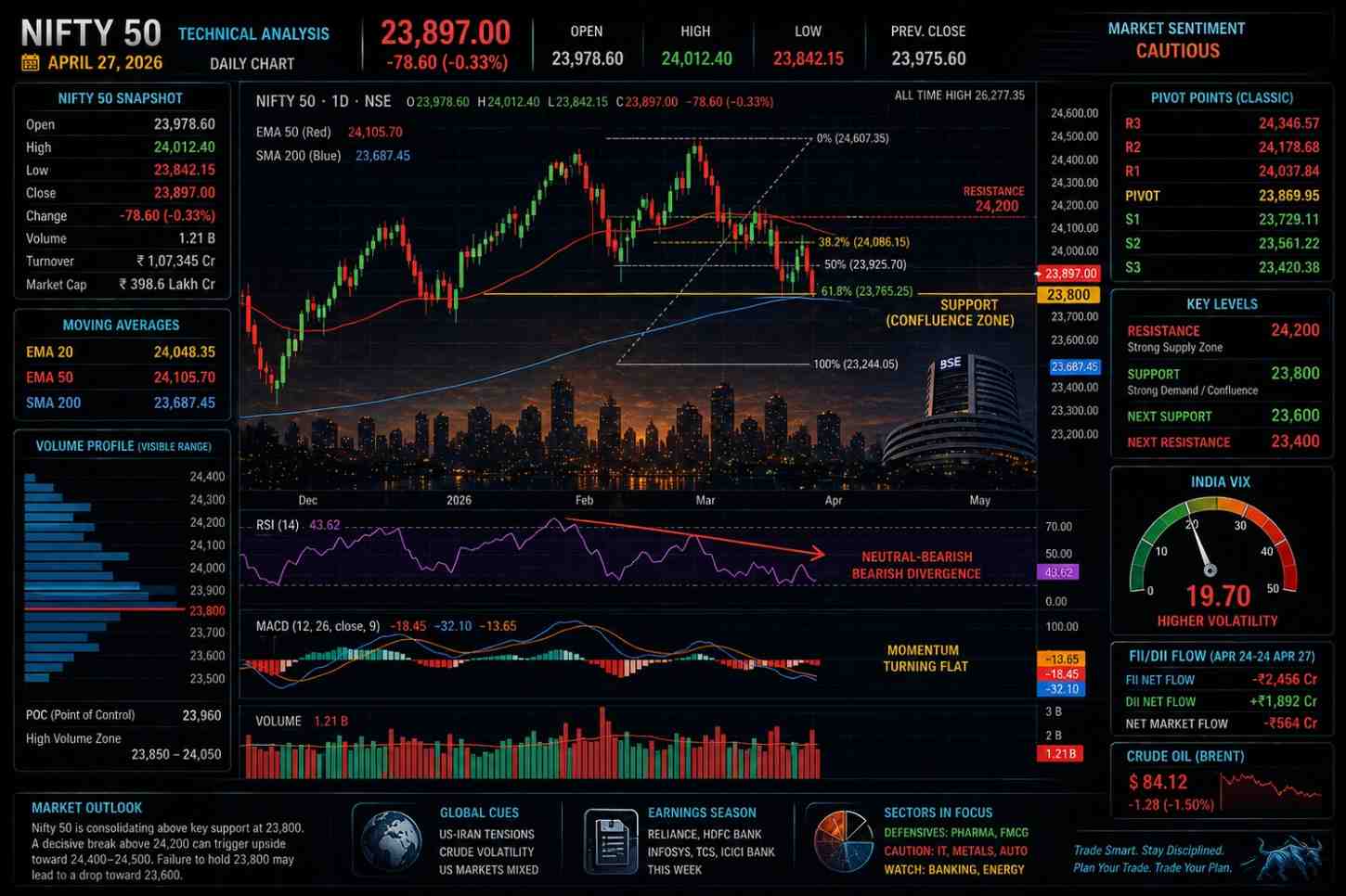 Chart patterns reinforce the story. On the weekly timeframe, we see a clear bearish engulfing candle two weeks back, yet the monthly chart still shows higher lows since the October 2025 base. The daily chart’s hammer-like candle on Friday is the most immediate bullish hint – provided it is confirmed by strong follow-through volume on Monday. Fibonacci extensions from the recent high point to 24,400–24,500 as the next logical upside target if bulls clear 24,200 with conviction. On the downside, a break below 23,600 opens the 61.8% retracement near 23,400, a level that would represent a 5–6% correction from April highs – deep enough to attract fresh long-term buying.