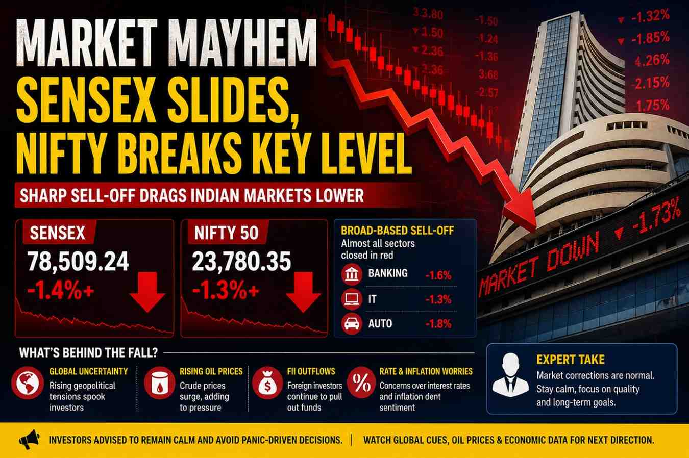 Despite the sharp fall, analysts advise investors to remain calm and avoid panic-driven decisions. Market corrections are a natural part of the investment cycle and often create opportunities for long-term investors to enter quality stocks at better valuations.