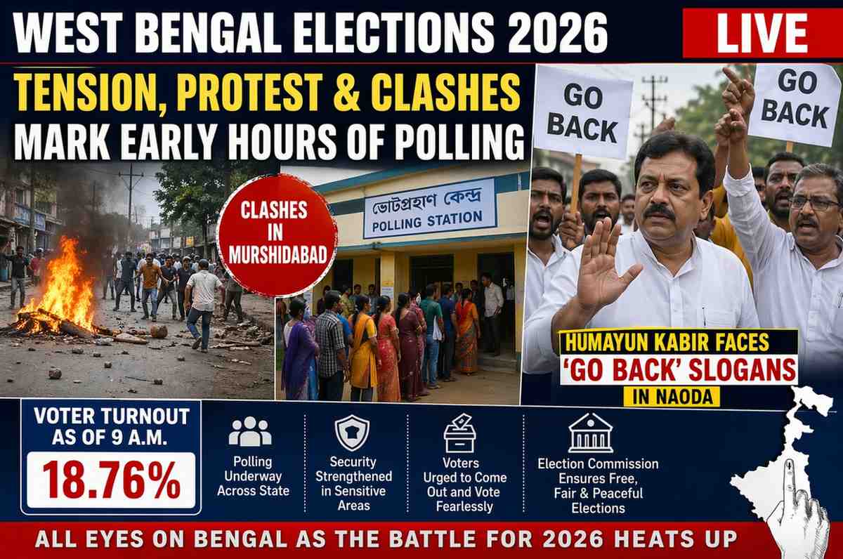 West Bengal witnessed a tense start to its 2026 विधानसभा चुनाव as reports of clashes and protests surfaced from several districts, particularly Murshidabad. The early hours of polling, which are usually seen as a test of voter enthusiasm and administrative preparedness, instead highlighted the ongoing political friction in the state.