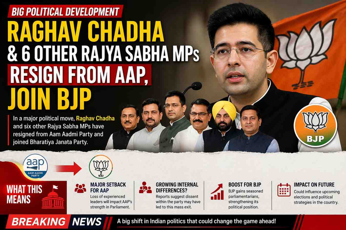 In a surprising turn of events, prominent leader Raghav Chadha along with several other Rajya Sabha Members of Parliament has resigned from the Aam Aadmi Party, marking a significant shift in India’s political landscape. The group has reportedly joined the Bharatiya Janata Party, triggering widespread discussions across political circles.