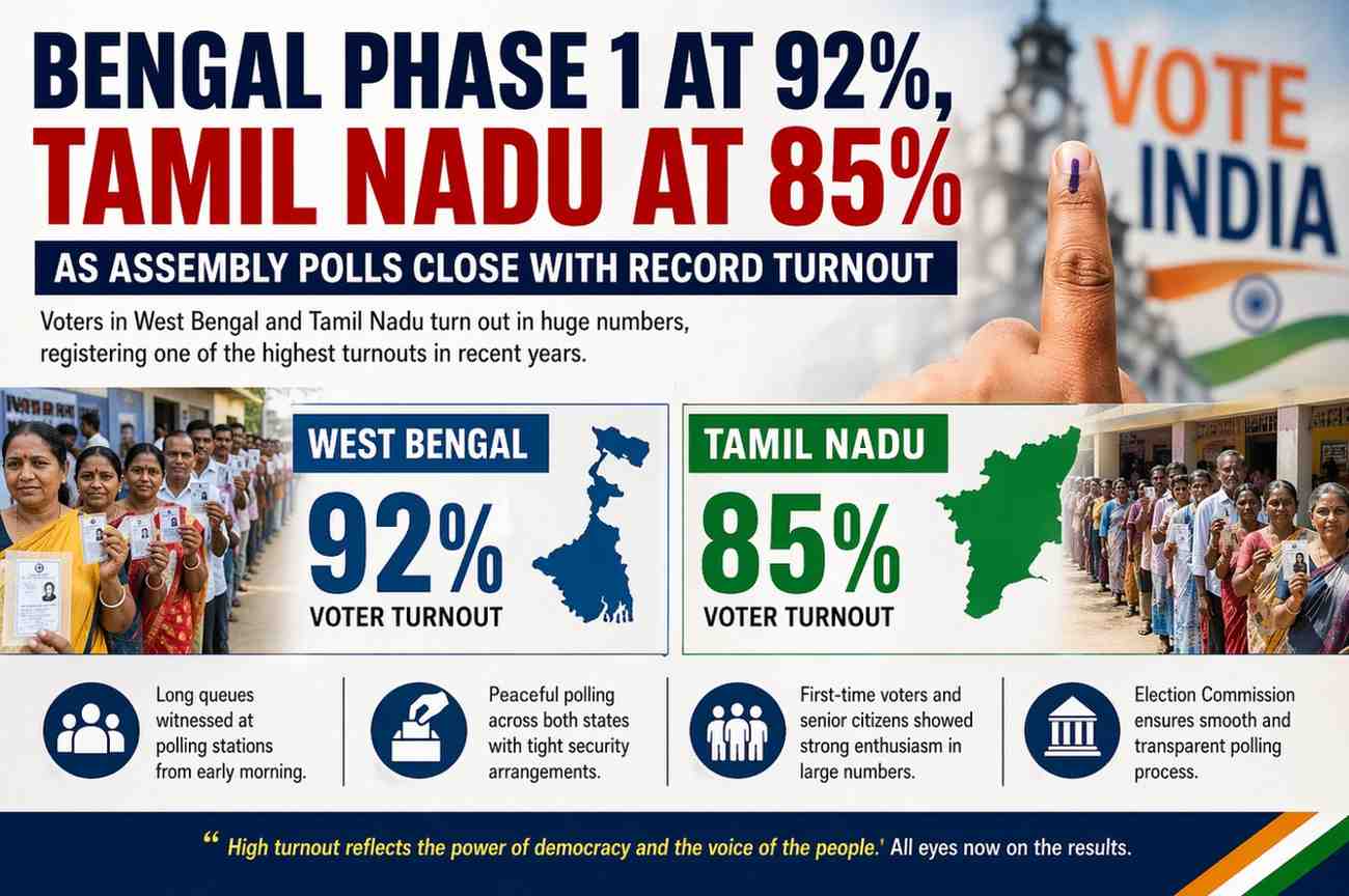 The first phase of assembly elections in West Bengal has set a new benchmark in voter participation, with an impressive turnout of nearly 92%. Meanwhile, Tamil Nadu also recorded a remarkable 85% turnout as polling concluded, reflecting an energized electorate across both states.