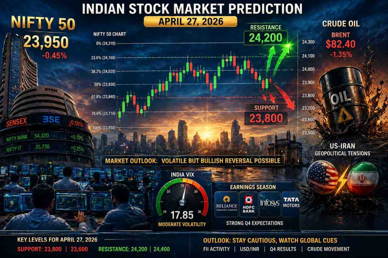 Indian equity markets wrapped up a choppy week on Friday, April 24, with the Nifty 50 settling at 23,897.95, shedding 1.87 per cent, while the Sensex closed at 76,664.21, down 2.33 per cent. For traders waking up to Monday, April 27, the big question is simple yet critical: will the indices find their footing or slide further into correction territory?