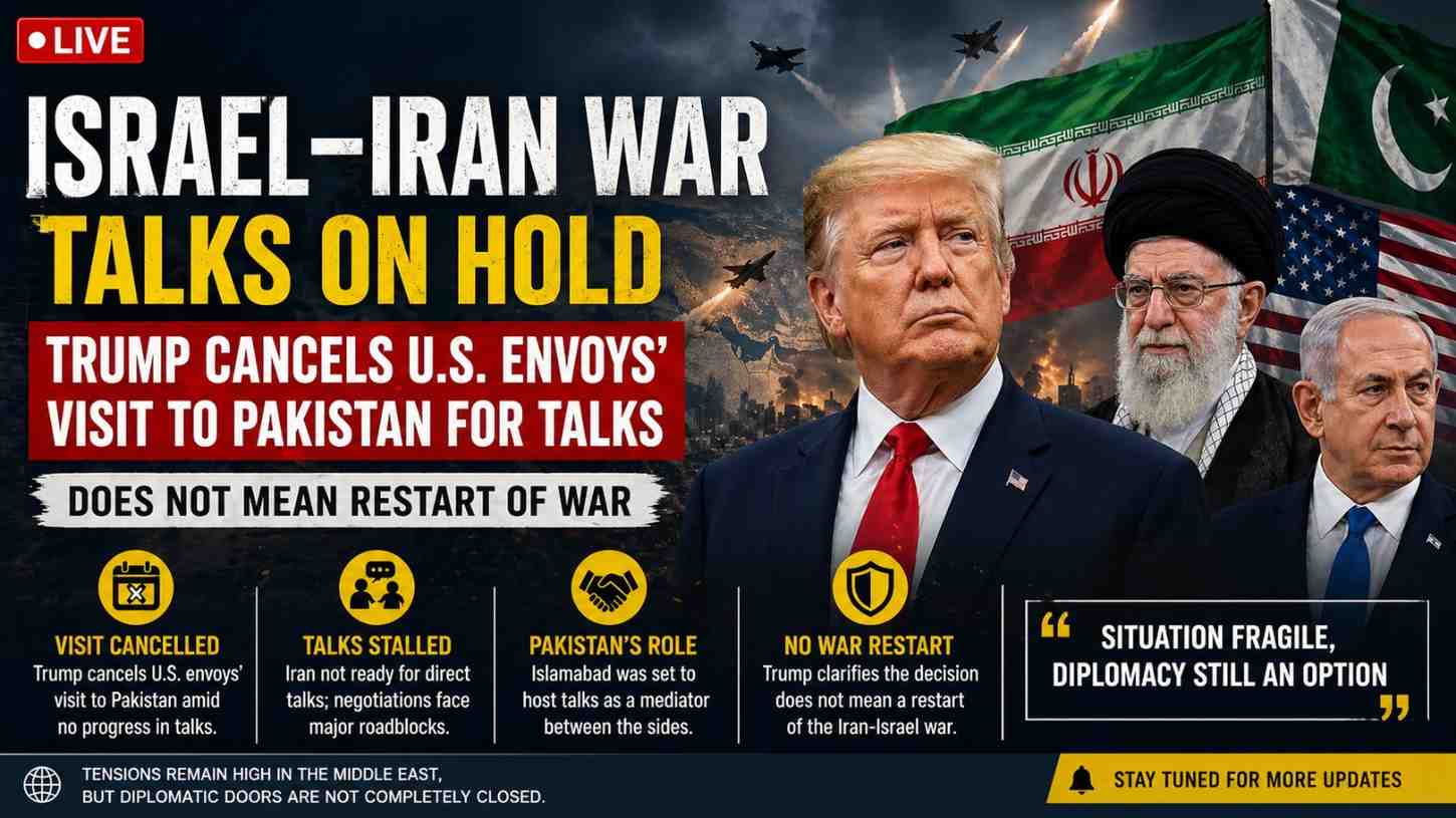 Middle East ki already sensitive situation me ek naya diplomatic twist dekhne ko mila hai. Donald Trump ne United States ke envoys ka Pakistan visit cancel kar diya hai, jahan Iran ke saath indirect peace talks hone wali thi. Yeh decision aise waqt par aaya hai jab region me tension high hai, lekin officially war restart hone ki koi confirmation nahi di gayi hai.