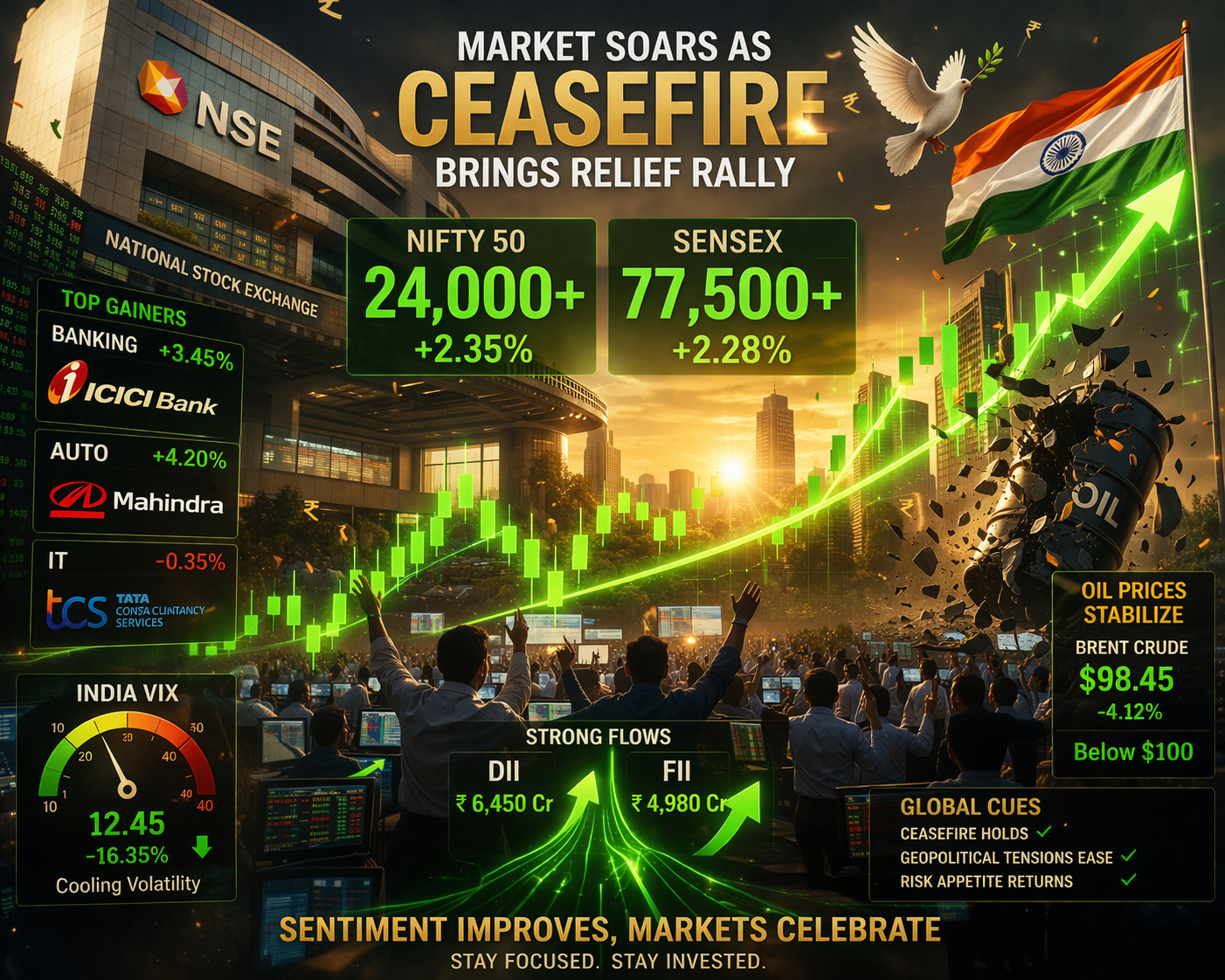 This wasn’t a random green candle. It was a textbook sentiment-driven relief rally built on three pillars: de-escalating geopolitics, benign commodity prices, and returning institutional confidence. The market had already priced in the worst-case oil shock; when that didn’t materialise, the rebound was swift and broad-based.